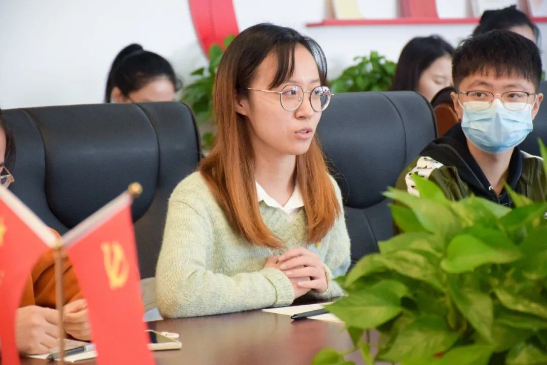 研究生代表陈舒婷提到习近平总书记在科教兴国这一部分指出要培养德智体美劳全面发展的社会主义建设者,作为青年,尤其是青年党员,我们更要以高标准、严要求规范自身;会中提到“自信自立,守正创新”,这也是规范我们研究生生活学习工作的准则,充分发挥当代大学生自信自立自强的精神风貌,将创新精神运用到论文写作中来,努力学习,完善自身,不忘初心,砥砺前行,努力成为社会主义接班人。