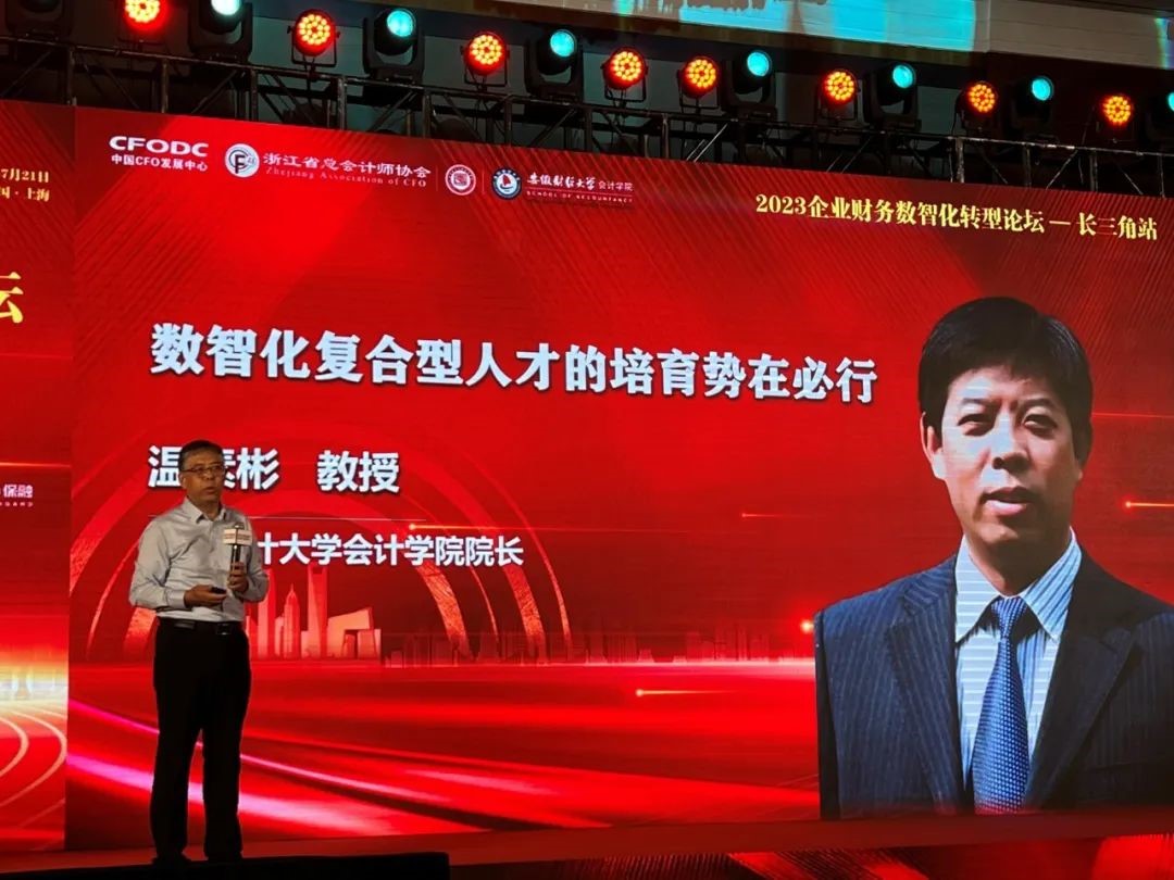 温素彬做了题为“数智化复合型财会人才的培育”的主题报告。从会计智能化之道、会计智能化之术、会计智能化之器、会计智能化之势、会计智能化之育五个方面阐述了新时代复合型财会人才的培育。