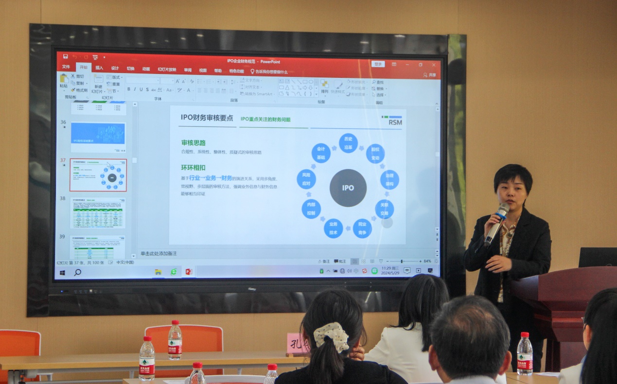 容诚会计师事务所苏州分所合伙人孔令莉展示微课“IPO企业财务规范”。以IPO财务审核要点为基点展开,从IPO关注问题,审核问询,成本核算,毛利率和研发费用以及关联方和关联交易的审核要点等多个方面进行讲解。