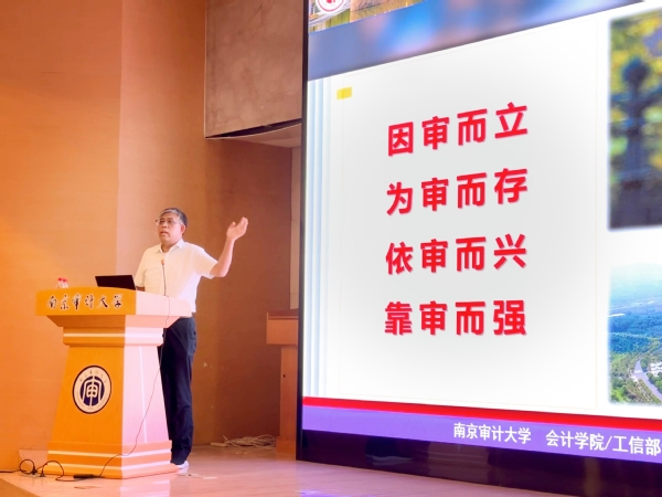 温素彬重点讲解了新时代会计学科的发展趋势和南京审计大学在培养“守护国家经济安全的财会卫士”方面的责任和担当。进而,从“优术、明道、取势”三个方面阐述了学习的不同境界,指出研究生要善于总结变化规律、洞察发展趋势,主动进行探索和创新。然后运用NLP认知层次模型引导同学们要转变认知方式,积极采取行动,提高综合能力,培养正确的价值观。接着以会计智能化的力、道、术、路为主旨,展示了会计智能化的内容及框架和学习要求,详细介绍了智能时代财会能力体系和南京审计大学会计智能化培养体系。