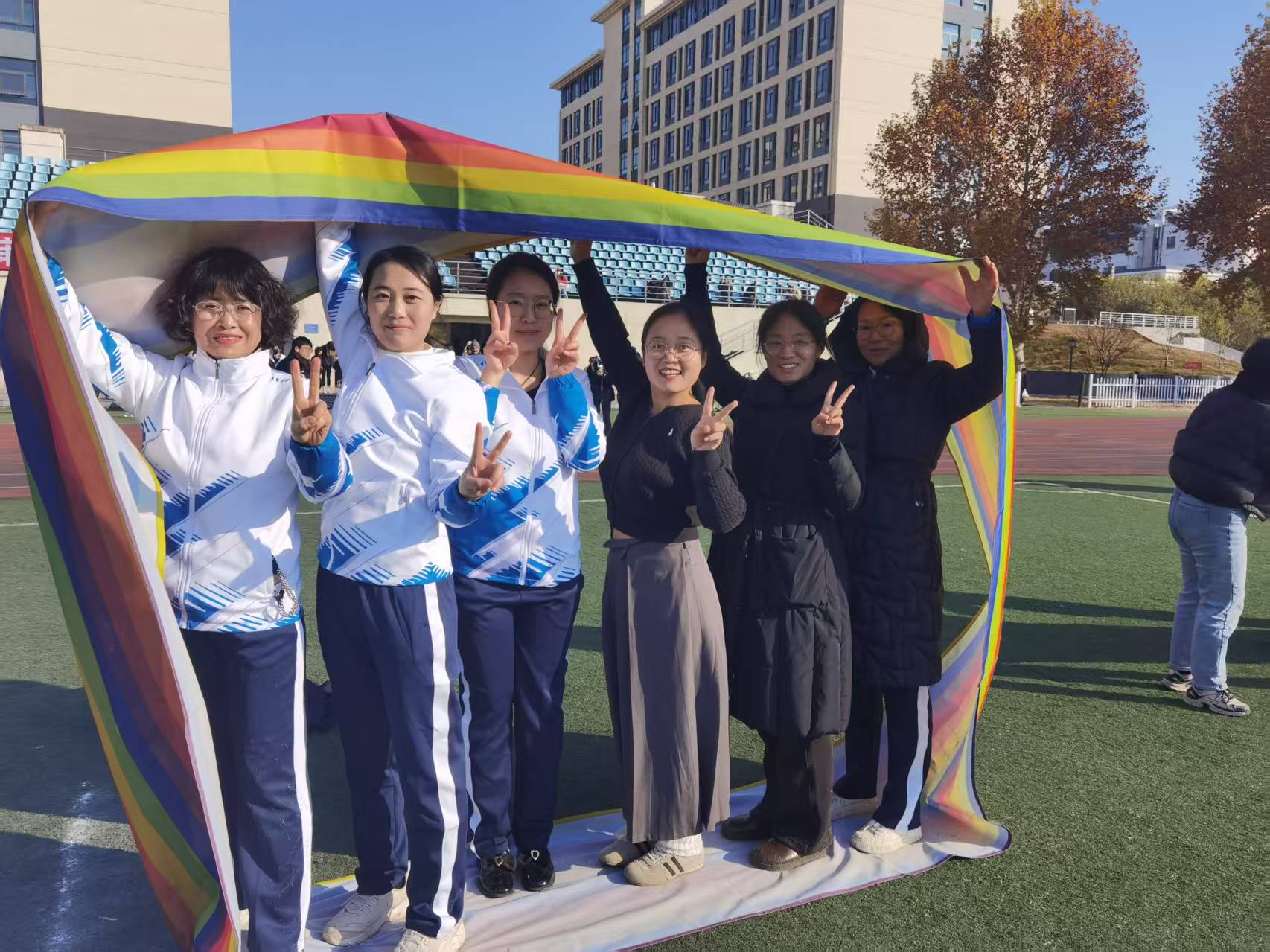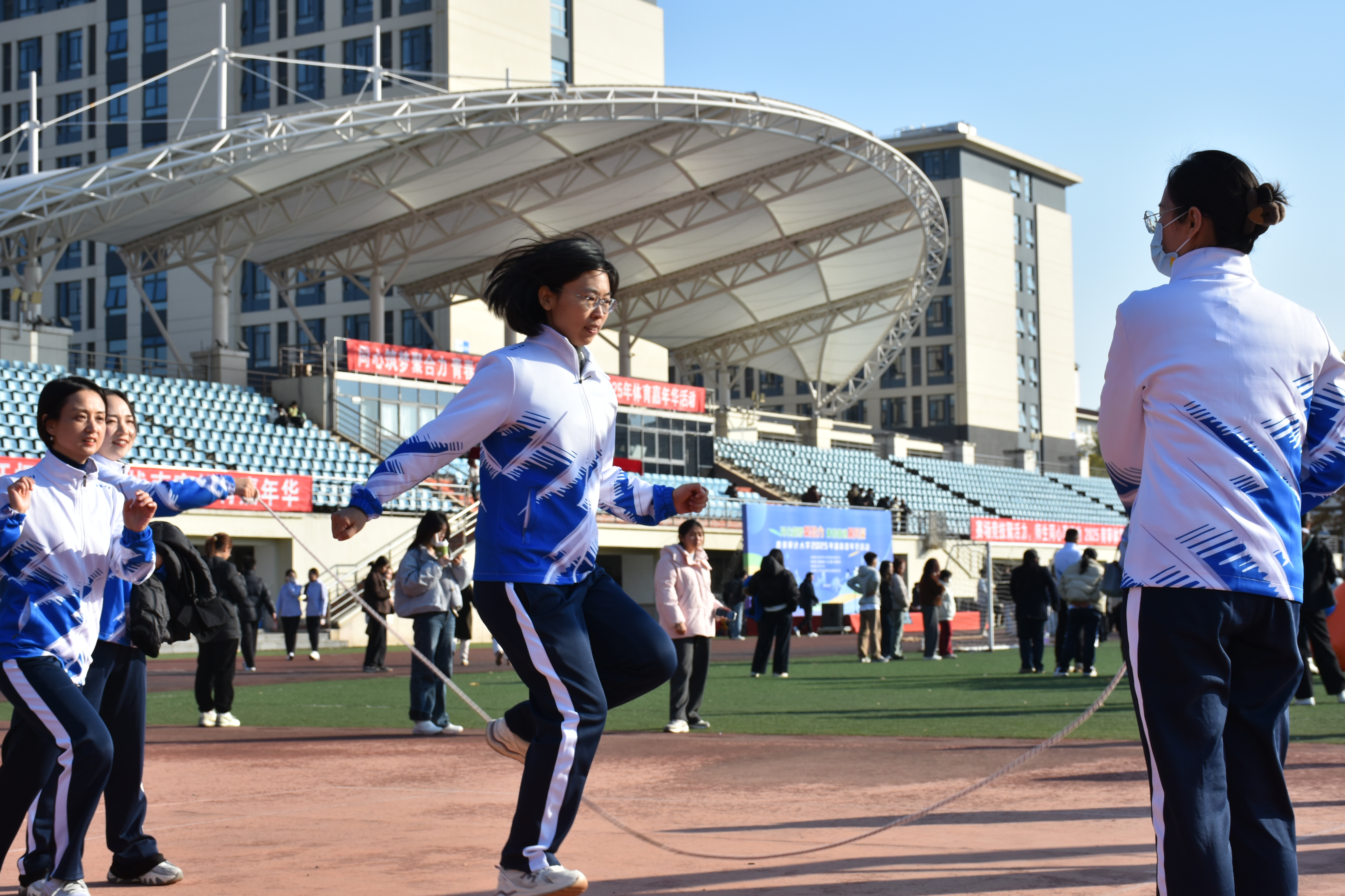 在“8”字集体跳绳比赛中,张菊香、王永青、陈兰、张洁、周樱樱、华诗涵6位女老师,在赛场上身姿轻盈、配合默契,以灵动的跳跃展现团队协作的风采,她们用活力与笑容诠释了运动的快乐,更以出色的表现彰显了学院教职工昂扬向上的精神风貌,成为冬日校园里一道亮丽的风景线。