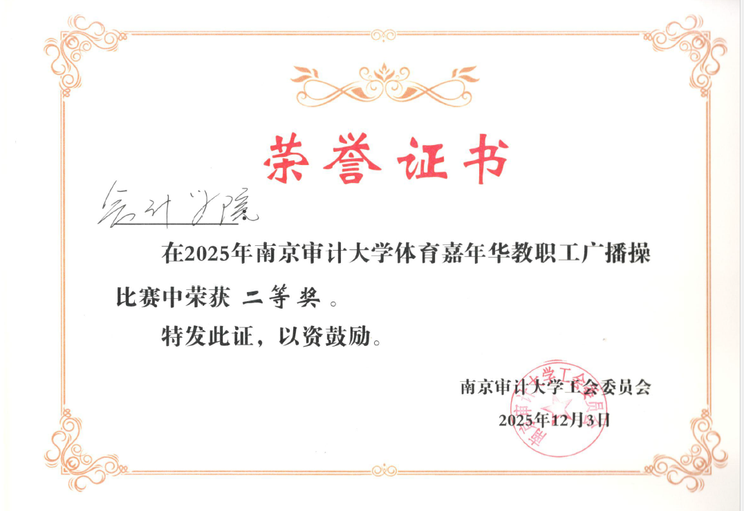 为响应学校全面加强和改进新时代体育工作的号召,丰富校园体育文化生活,12月3日下午,南京审计大学教职工广播操比赛和趣味项目比赛在润园操场如期举行。69成人网 分工会组建的教职工广播操参赛队伍凭借整齐划一的动作、昂扬向上的风貌,在激烈角逐中脱颖而出,荣获二等奖的优异成绩。