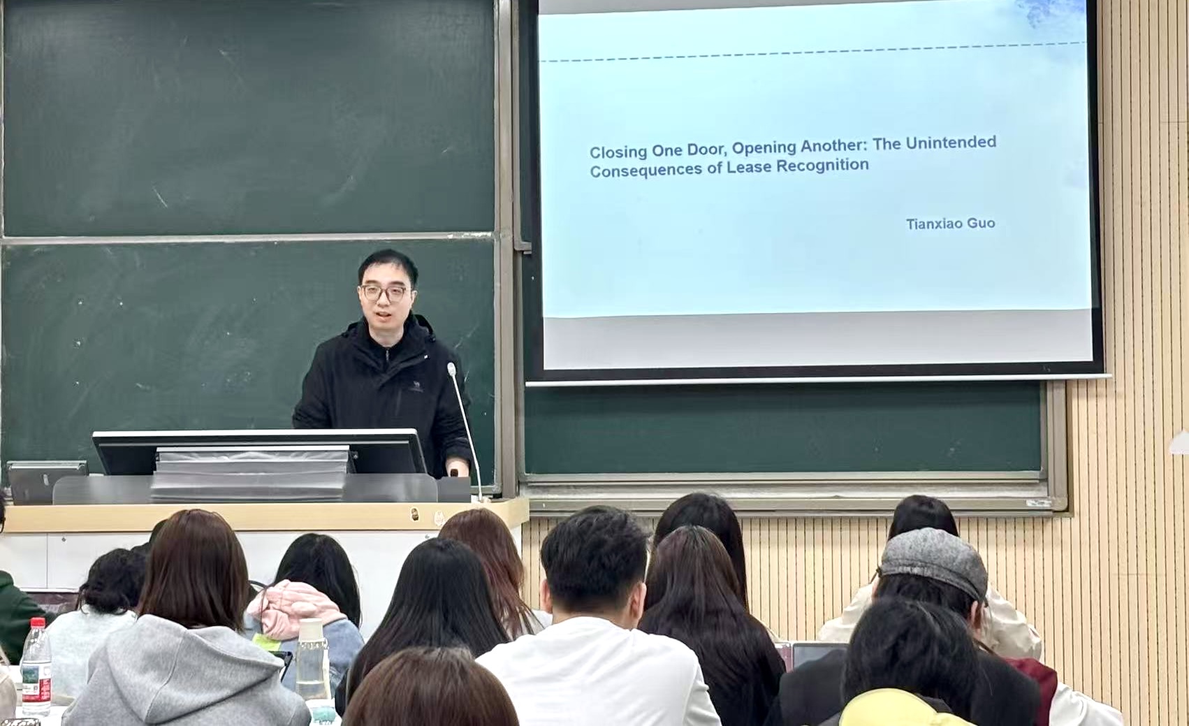2026年4月8日,69成人网 邀请郭天枭老师开展新租赁准则专题学术讲座。讲座围绕新租赁准则的核心内容、研究背景、实证发现、企业应对策略及研究启示五大模块全面梳理了新租赁准则的变革脉络与实践影响,69成人网 研究生参加讲座。
