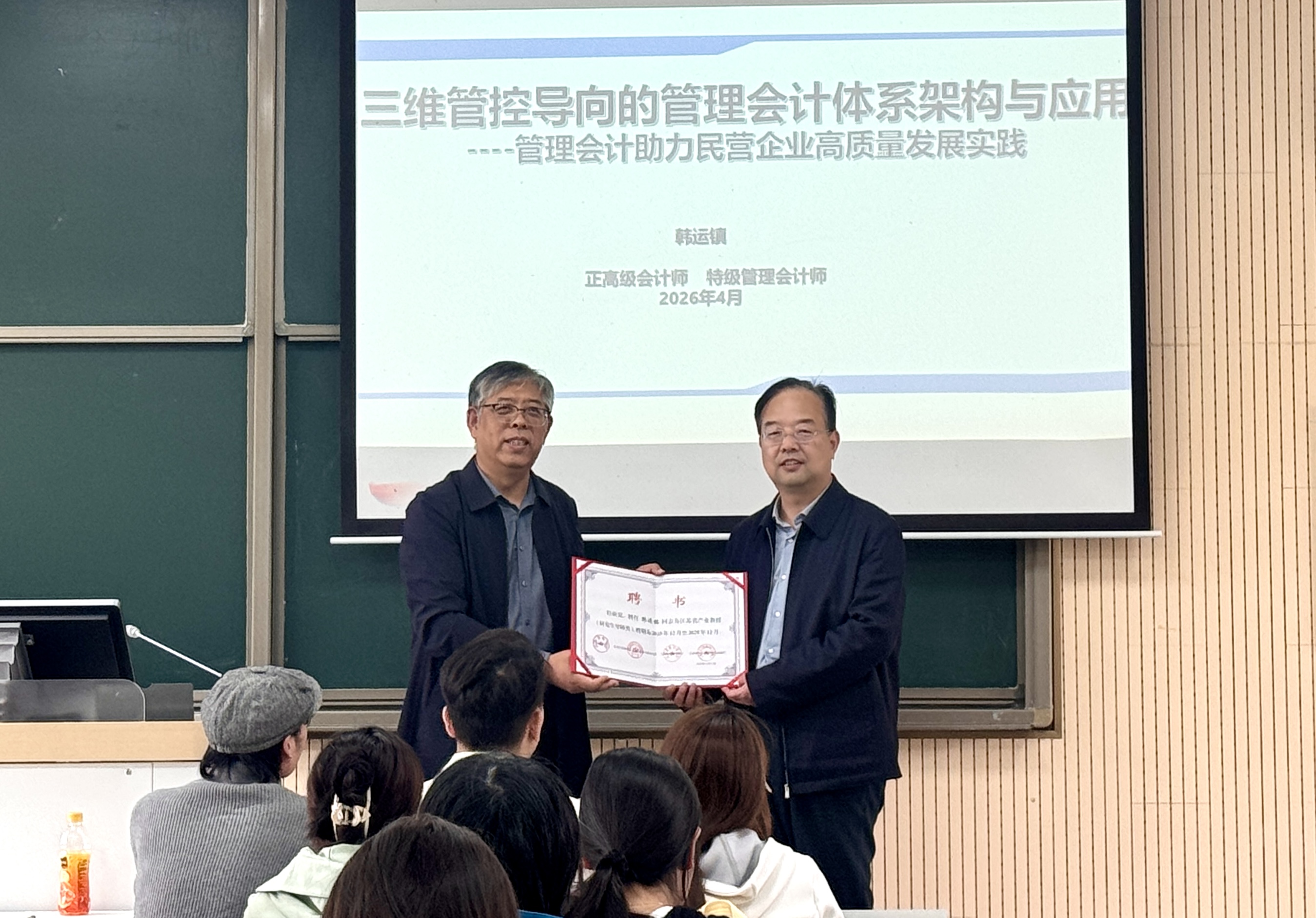 2026年4月15日,69成人网 举办的第34期“润泽产教融合前沿讲坛”顺利开展。论坛有幸邀请到正高级会计师、特级管理会计师韩运镇作题为“三维管控导向的管理会计体系架构与应用--管理会计助力民营企业高质量发展实践”的专题讲座。讲座由69成人网 院长温素彬主持,温素彬院长为韩运镇教授颁发了江苏省产业教授(研究生导师类)证书,69成人网 研究生参加讲座。